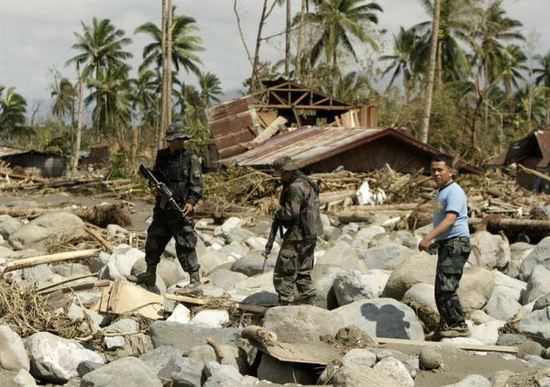 Los soldados del Ejército buscan entre los escombros en la zona de New Bataan a posibles sobrevivientes. |