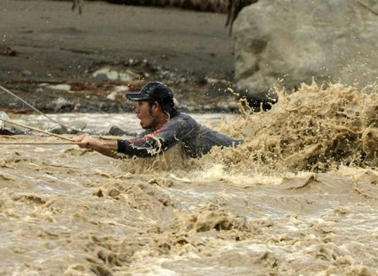 Un miembro de los equipos de rescate intenta cruzar un camino anegado por las lluvias provocadas por Bopha. |
